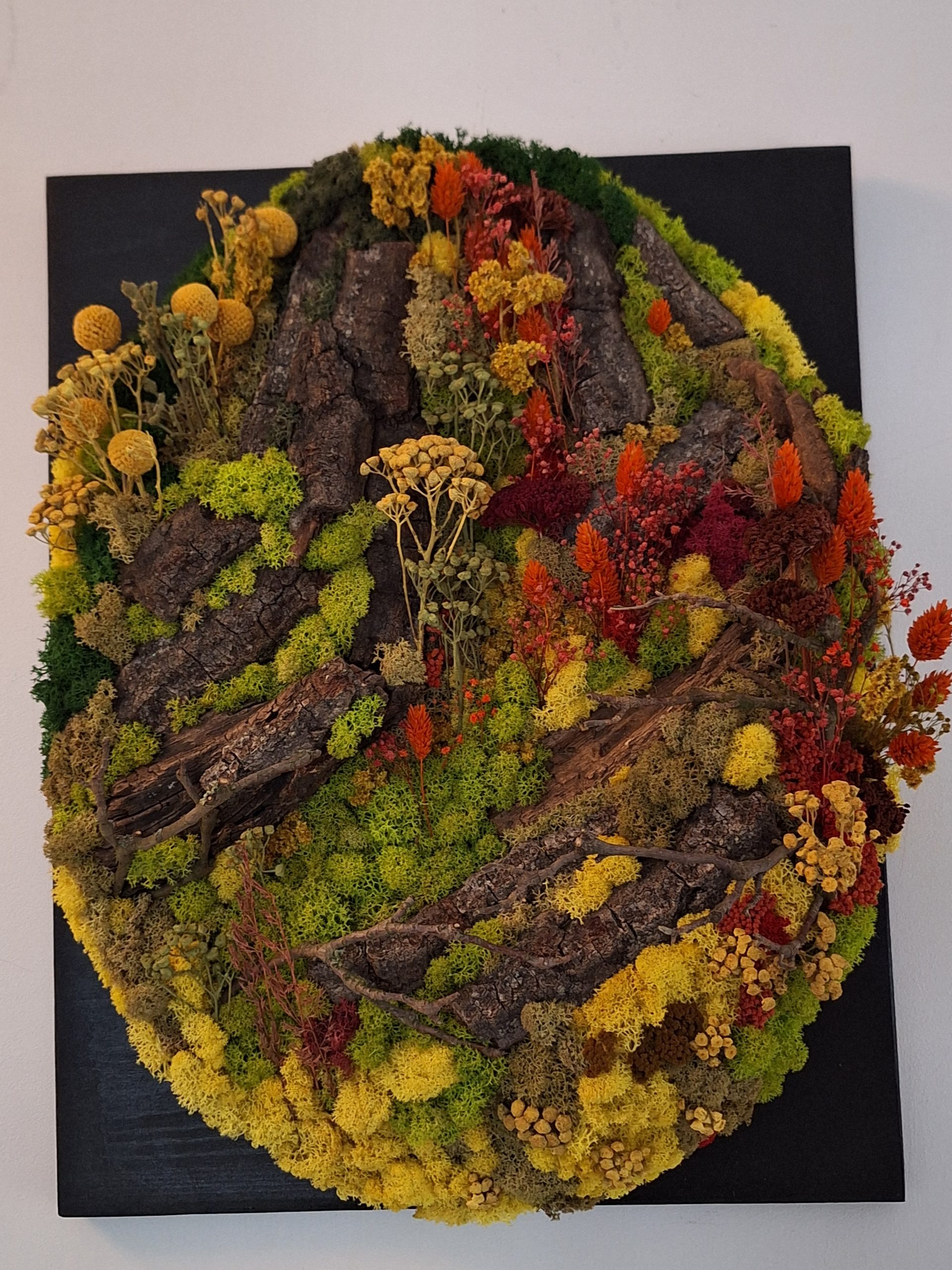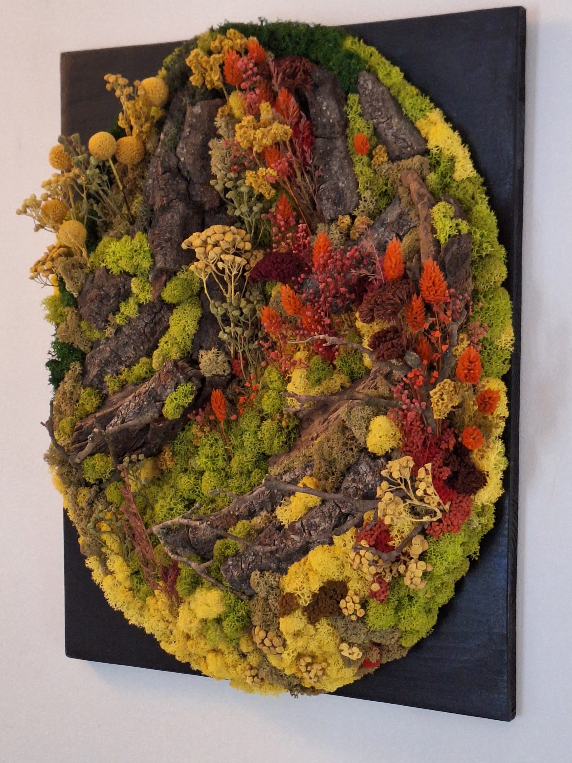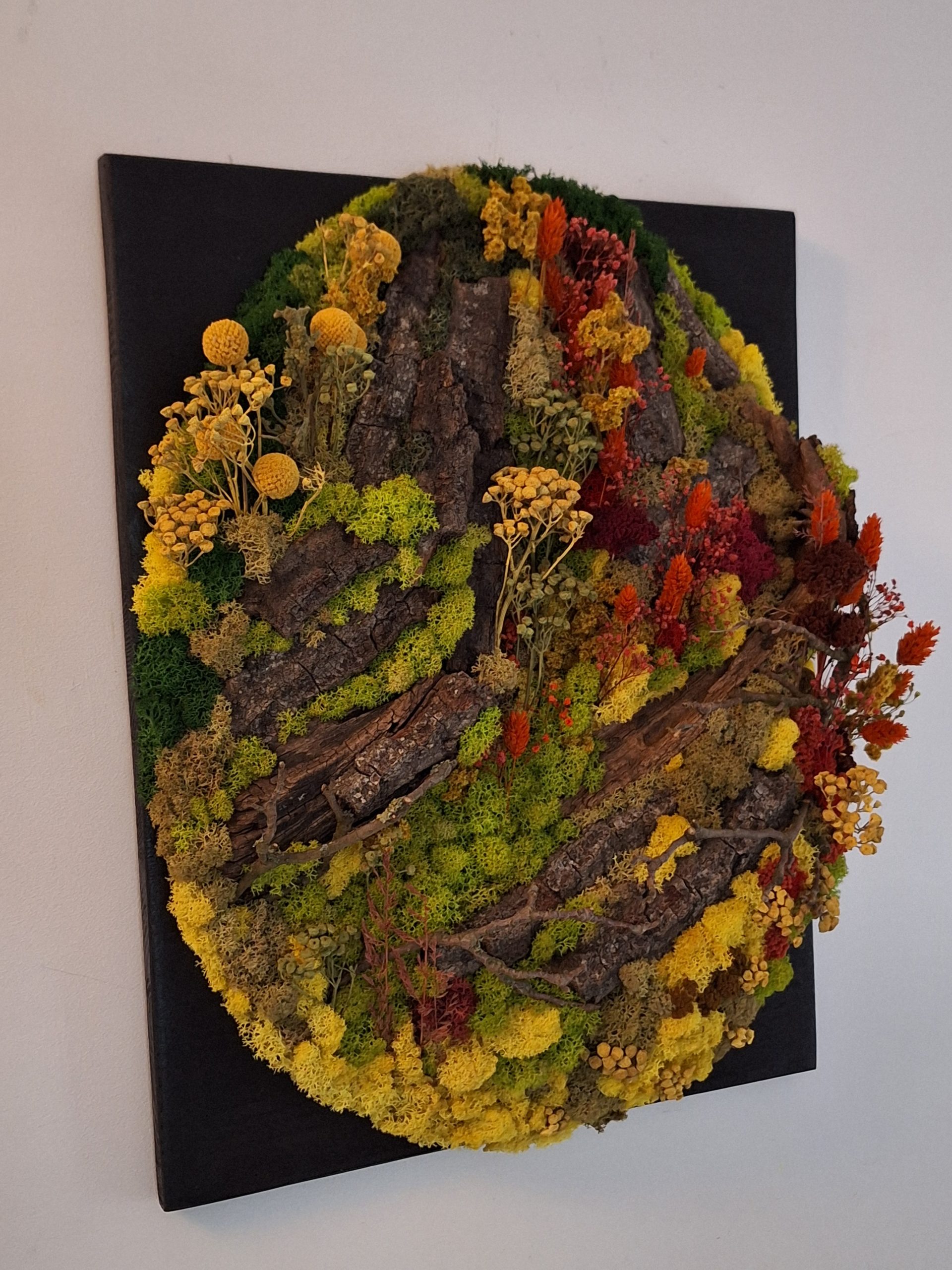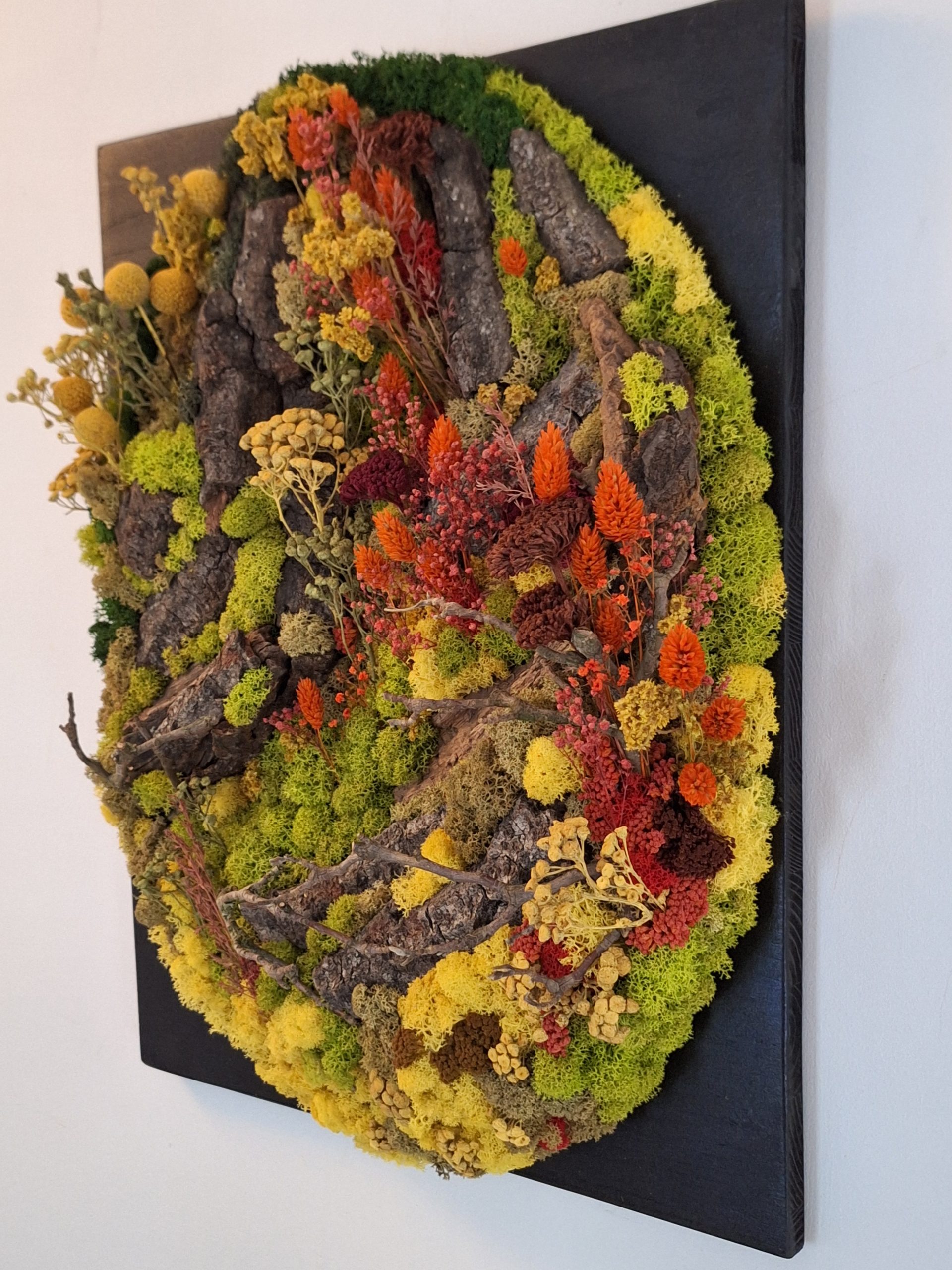 Tablou cu licheni și plante stabilizate, naturale, pe lemn masiv. Un tablou ce încântă atat prin varietatea culorilor magice ale toamnei, dar si ale diferențelor de inaltime ale reliefului, de pana la 10cm, precum și prin aspectul delicat, pufos, al lichenilor și diversitatea plantelor utilizate.